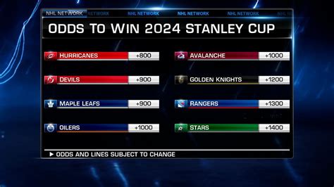 The Colorado Avalanche topped the Stanley Cup odds board back in November and haven't looked back since. Meanwhile, the Tampa Bay Lightning have played themselves into a Top 2 spot, with Carolina falling to third. Here's a look at the NHL odds to hoist Lord Stanley's hardware this season. Odds as of 12-9. NHL: Stanley Cup Betting Odds - FanDuel Sportsbook Find the latest & highest NHL outright winner odds for next team to lift the Stanley Cup, from the top bookies licensed for Sweden. NHL Playoff Odds updated many times a day . Stanley Cup Odds, Playoff seeding, and Draft Lottery Odds. US Ice Hockey Betting, Odds & Results 2 days ago — NHL 2026-26 Stanley Cup playoff chances and projected standings ; #1. Lightning. 84 pts ; #2. Avalanche. 97 pts ; #3. Hurricanes. 90 pts ; #4. Stars. Stanley Cup Odds & Favorites 2026: NHL Stanley Cup Betting Lines ... Get the best available Stanley Cup odds from all online bookmakers with oddschecker, the home of betting value. 2026 Stanley Cup Odds: Oilers, Panthers Lead Early ...