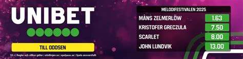 Melodifestivalen odds 2026 » Mello, final, bidrag Ett annat spelbolag med grymma Melodifestivalen odds är Unibet . De är kända för att ha mängder av odds på olika event och specialiteter, bland dessa hittar du ... Odds Inför Deltävling 2 - Speltips Melodifestivalen 2026 4 Feb 2026 — Vilka är oddsfavoriterna i Melodifestivalen deltävling 2 ? Kolla in de senaste oddsen, analyserna och bettingtipsen inför lördagens tävling ... 5 Mar 2026 — Inför lördagens Mellofinal pekar Unibet odds på att Måns Zelmerlöw tar hem det för andra gången, efter starkast stöd från den ... Sweden: Who will win Melodifestivalen 2026? Bookmakers have predicted Måns Zelmerlöw with best odds. 30 Jan 2026 — Följ spänningen i Mello 2026! Se aktuella odds inför deltävling 1 och upptäck vilka artister som har störst chans att gå till final. Finalen i Mello 2026 närmar sig ! Se aktuella melodifestivalen final odds & speltips. Vilken artist vinner? Spela på din favorit med Unibet Sverige. 8 Mar 2026 — Dagen vi alla väntat på är här: Ikväll avgörs Melodifestivalen. Oddsen pekar ut en viss skåning som solklar vinnare – ... Unibet , Svenska Spel och ...